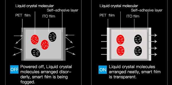 When the power is switched off, the liquid crystal molecules are randomly oriented, scattering light, and then our switchable Smart-Film Blinds become opaque (frosted, private).